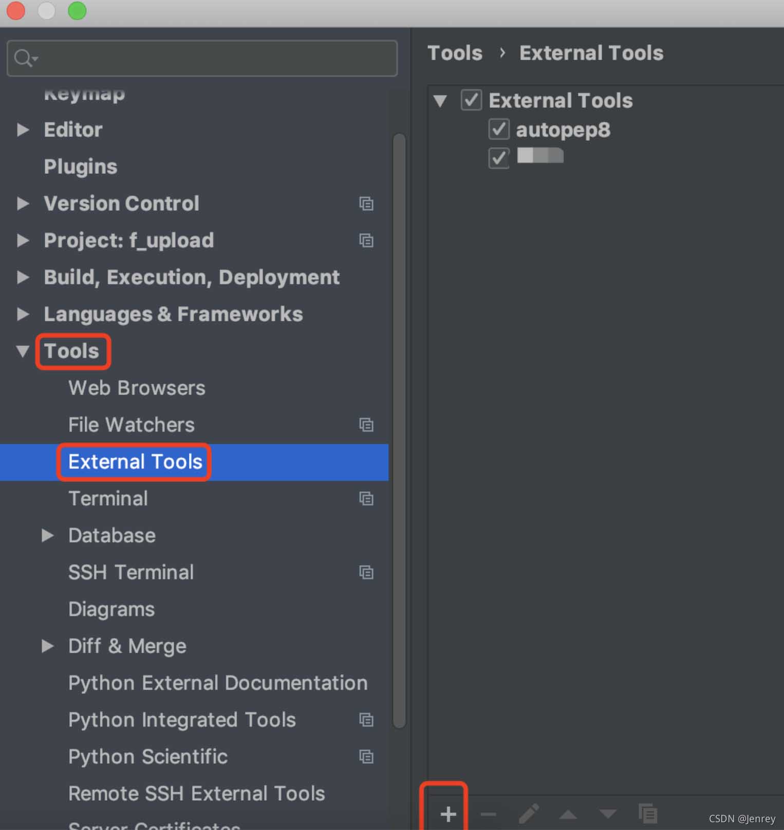 pyCharm菜单栏–>「File」–>「Settings」–>「Tools」–>「External Tools」–>点击加号添加工具。