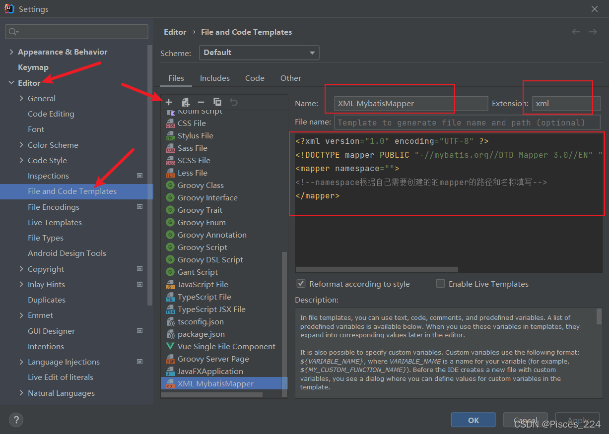点击 + 号,新建模板,输入易识别的名字,然后后缀是 xml,在下方框里输入mybatis-mapper.xml的通用模板内容,然后点击应用。 模板如下: