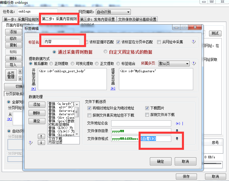 1.保存文件名yyyyMMddHHmmss中表示以年月日时分秒为图片的文件名,火车头采集器软件会在正文中一次性正则匹配到所有图片,同时建立下载进程,这个时候以秒为单位就会让所有的图片是同一个文件名,在后面加一个“自增ID“来区别不同图片