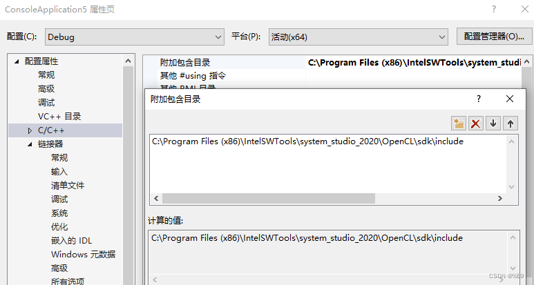 打开配置属性,包含OpenCL的头文件,即将C:\Program Files (x86)\IntelSWTools\system_studio_2020\OpenCL\sdk\include