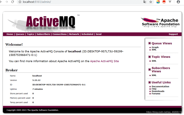 点击Manage ActiveMQ broker登录到ActiveMQ管理页面,默认账号和密码都是admin。管理页面如下: