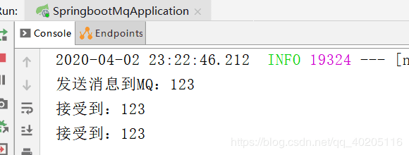 运行项目在浏览器中访问http://localhost:8080/mq/topicsendmsg?msg=123。向消息队列中发送123。控制台输出效果(有两个消费者方法):