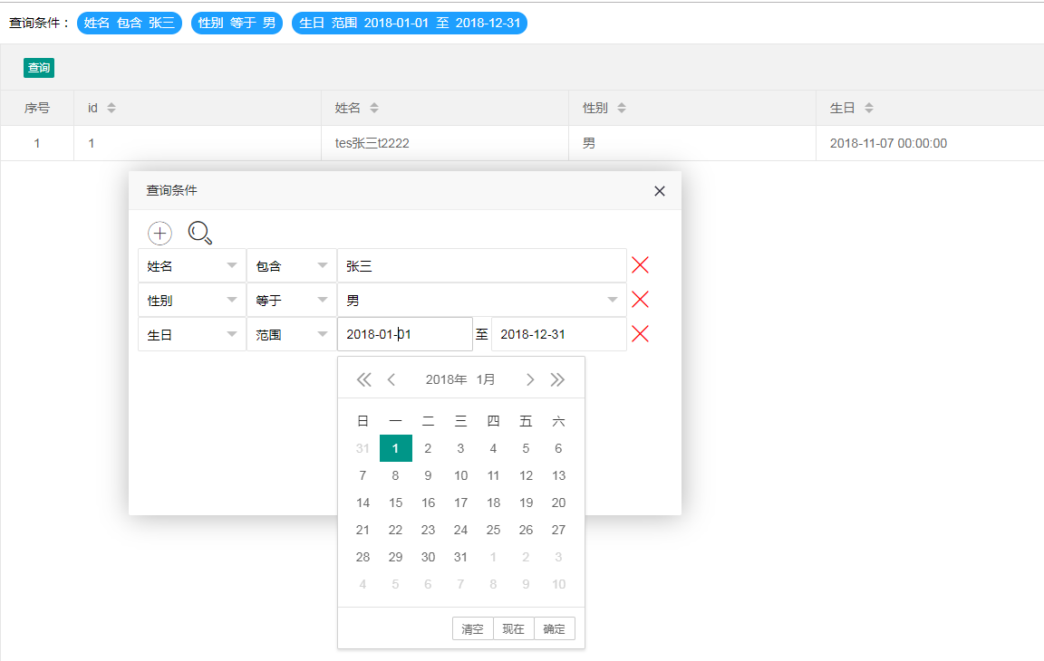 dc.setCondition([["Layuiex.name","like","张三"],["Layuiex.sex",null,"1"],["Layuiex.birthday","between","2018-01-01","2018-12-31"]]);