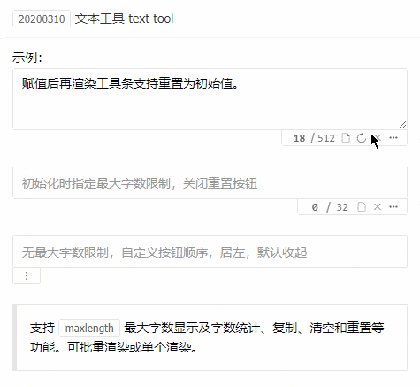文本输入框、文本域扩展工具条,支持输入字数统计、最大字数 maxlength 显示、复制输入框文本、重置和清空输入框内容。可收起或展开工具条、自定义工具条按钮和按钮顺序等。